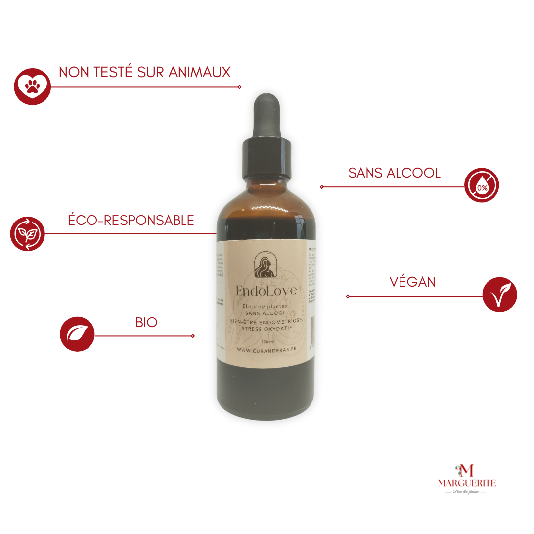 Découvrez l'Élixir ENDO Love de CURANDERAS , une synergie de plantes BIO spécialement conçue pour accompagner les femmes atteintes d' endométriose . Son action ciblée aide à apaiser les douleurs, soutenir l' équilibre hormonal et favoriser un confort optimal au quotidien.
